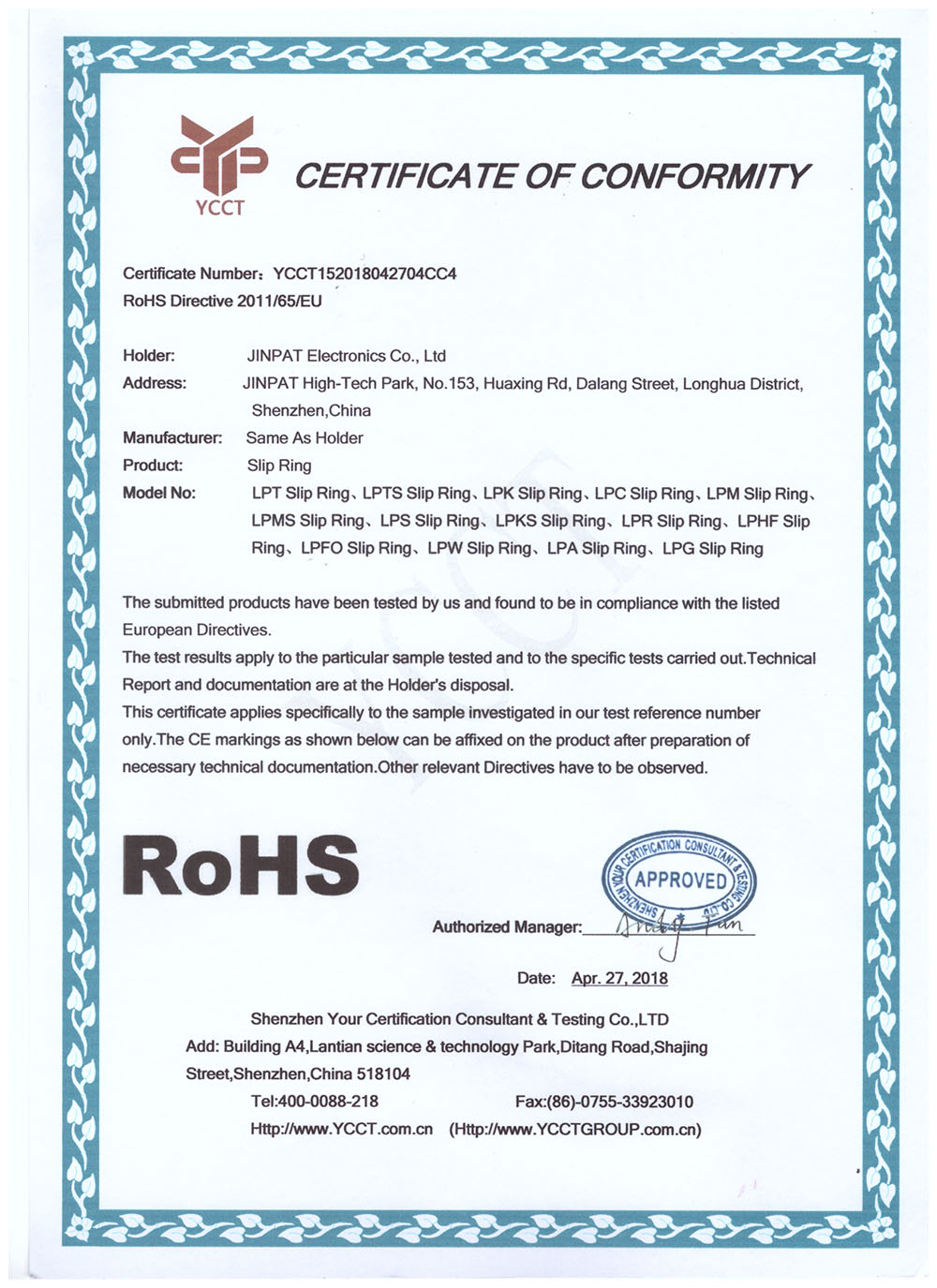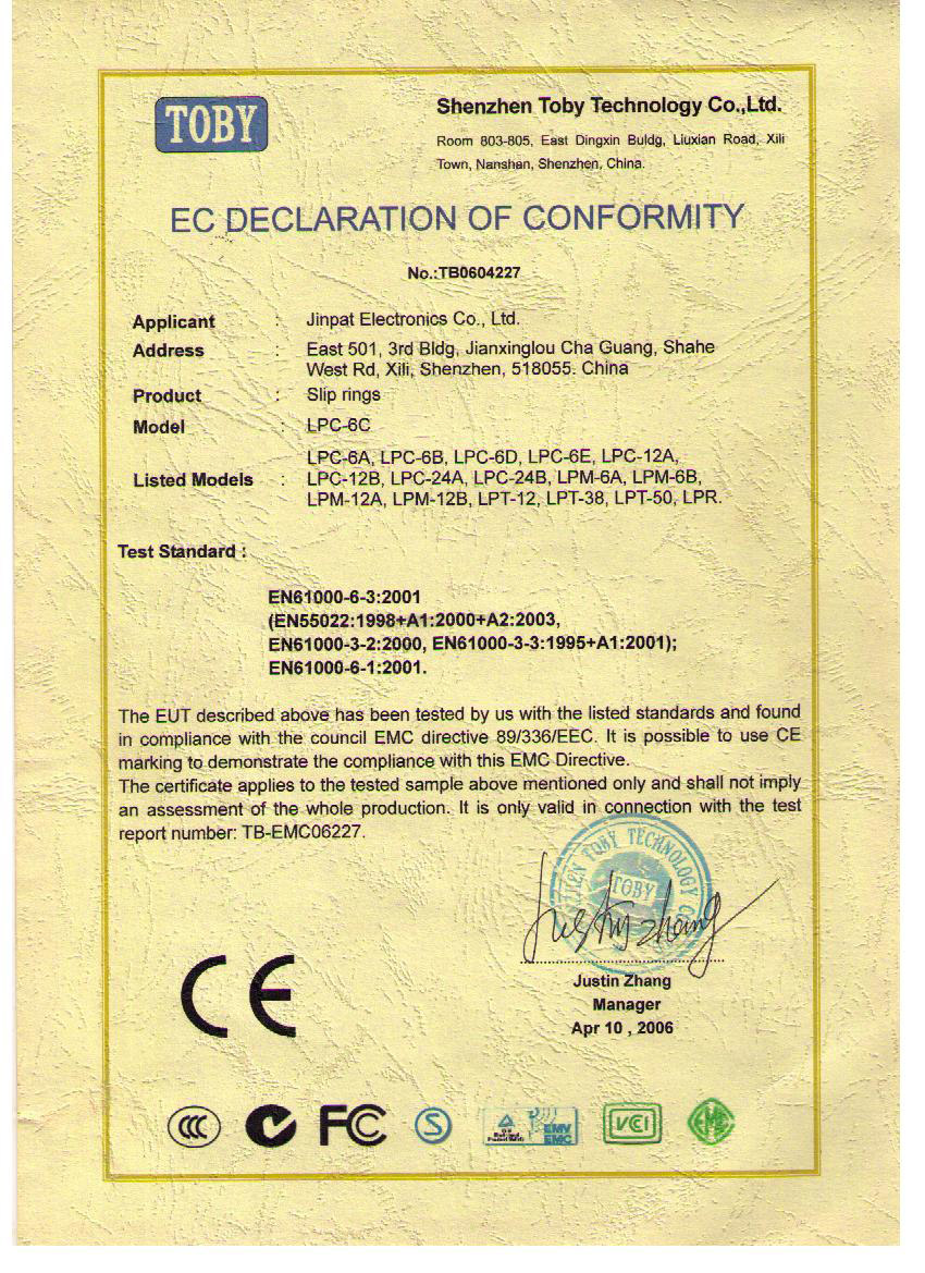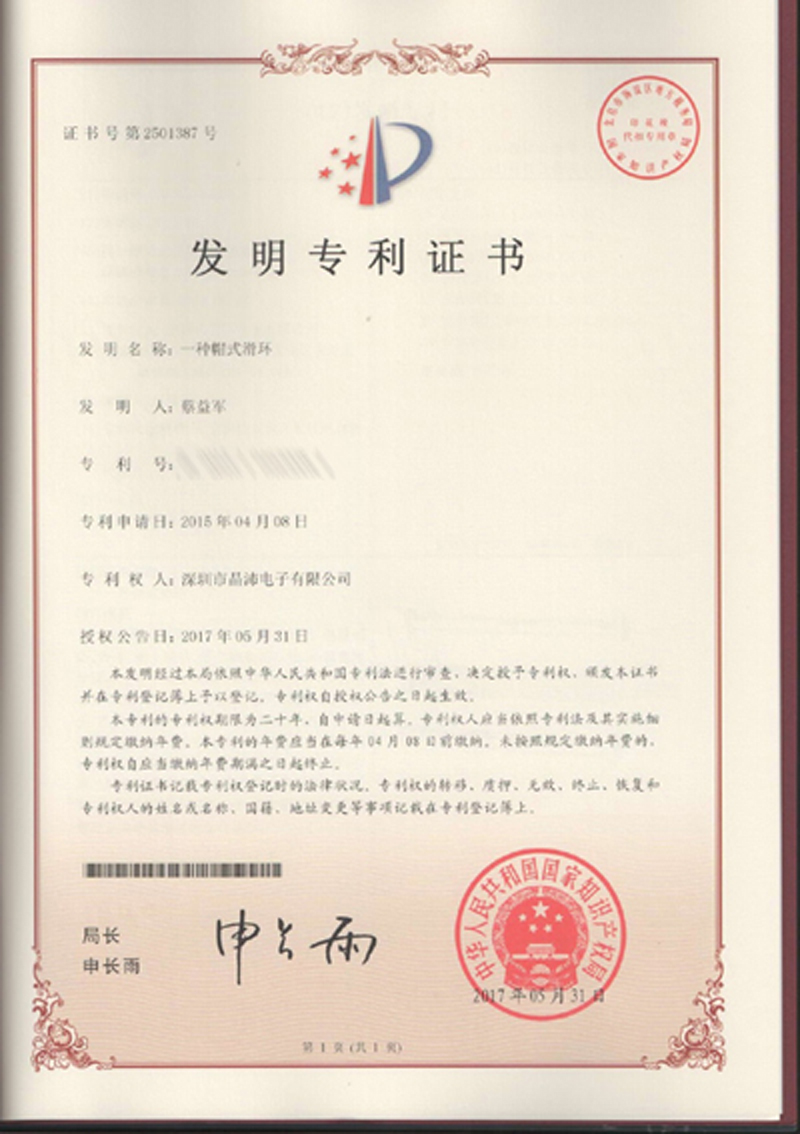 晶沛通過(guò)了歐盟CE認(rèn)證耳濡目染、FCC認(rèn)證飘风过耳、SGS認(rèn)證各抒己见、BV“船級(jí)社”認(rèn)證、防爆認(rèn)證等多項(xiàng)認(rèn)證,生產(chǎn)的導(dǎo)電滑環(huán)都符合RoHS環(huán)保要求,先后被授予“國(guó)家高新技術(shù)企業(yè)”稱(chēng)號(hào),目前已獲得45項(xiàng)專(zhuān)利,其中發(fā)明專(zhuān)利6項(xiàng)。
